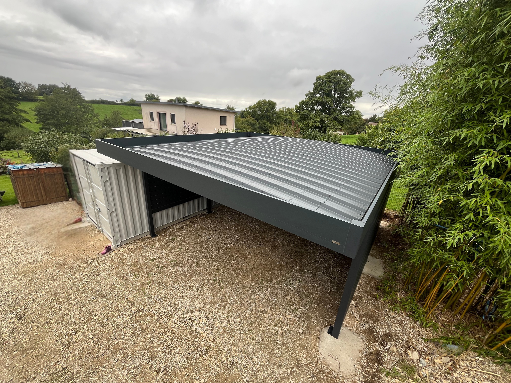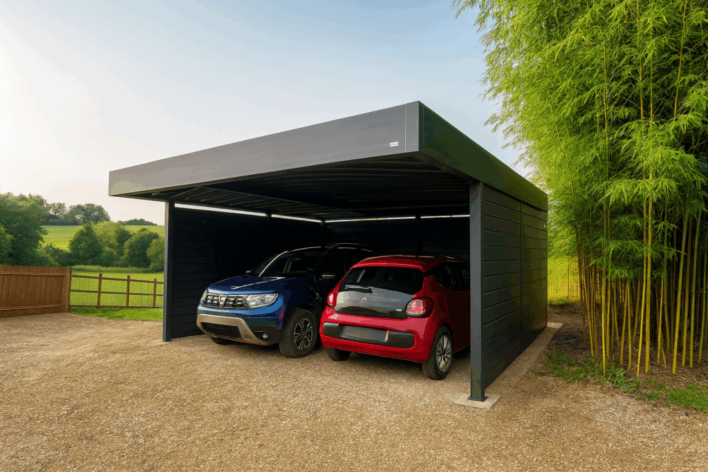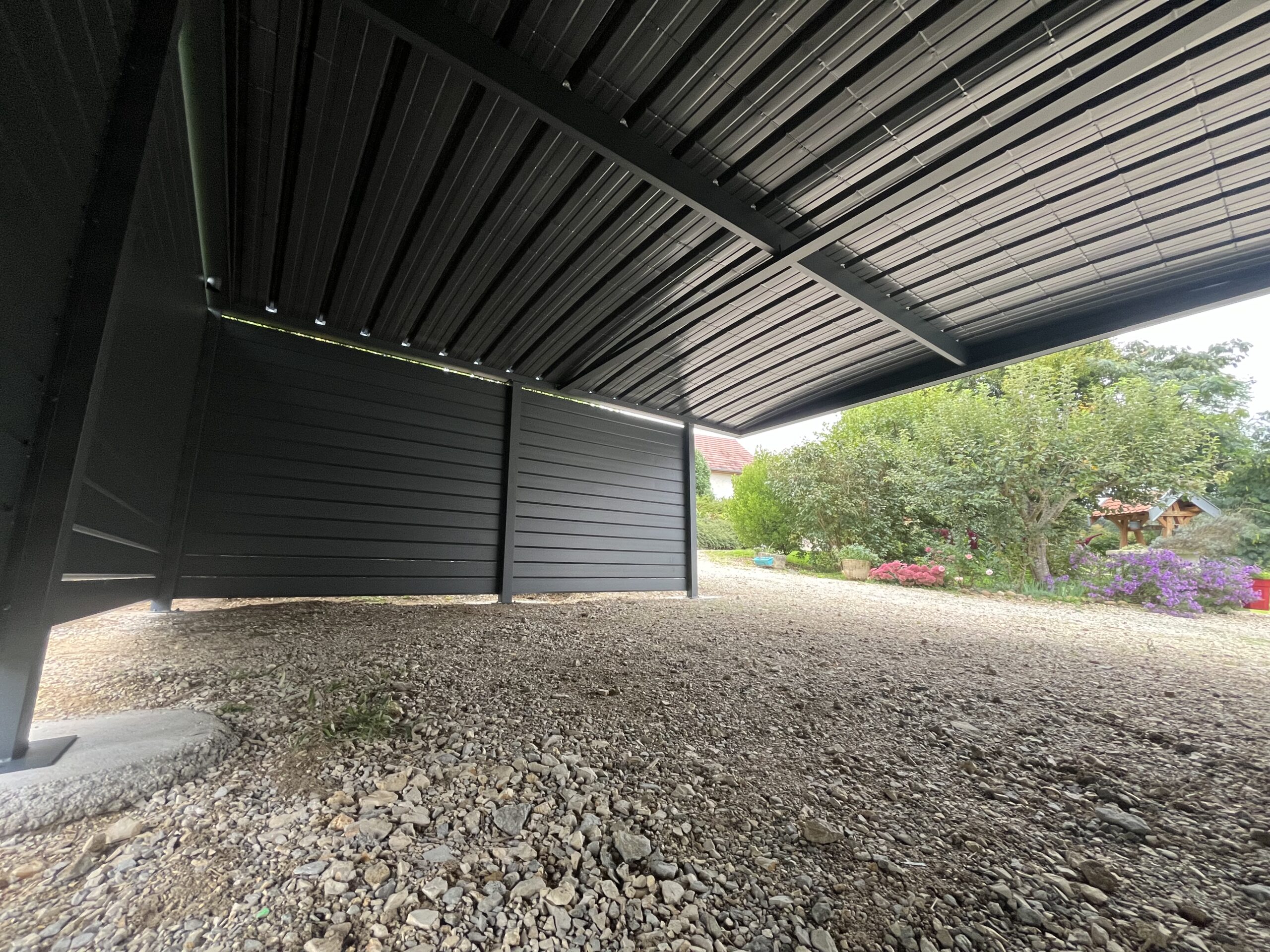 Réalisation d’un abri voiture sur mesure couvert pour double stationnement. Remplissage avec lames brise vue occultantes.