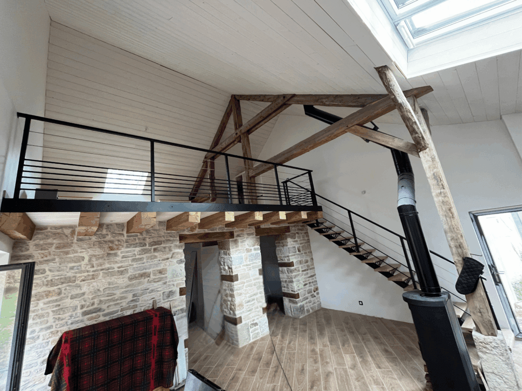 Création d’accès et mise en valeur d’une habitation de charme grâce à cet ensemble escalier limon centrale et garde-corps.