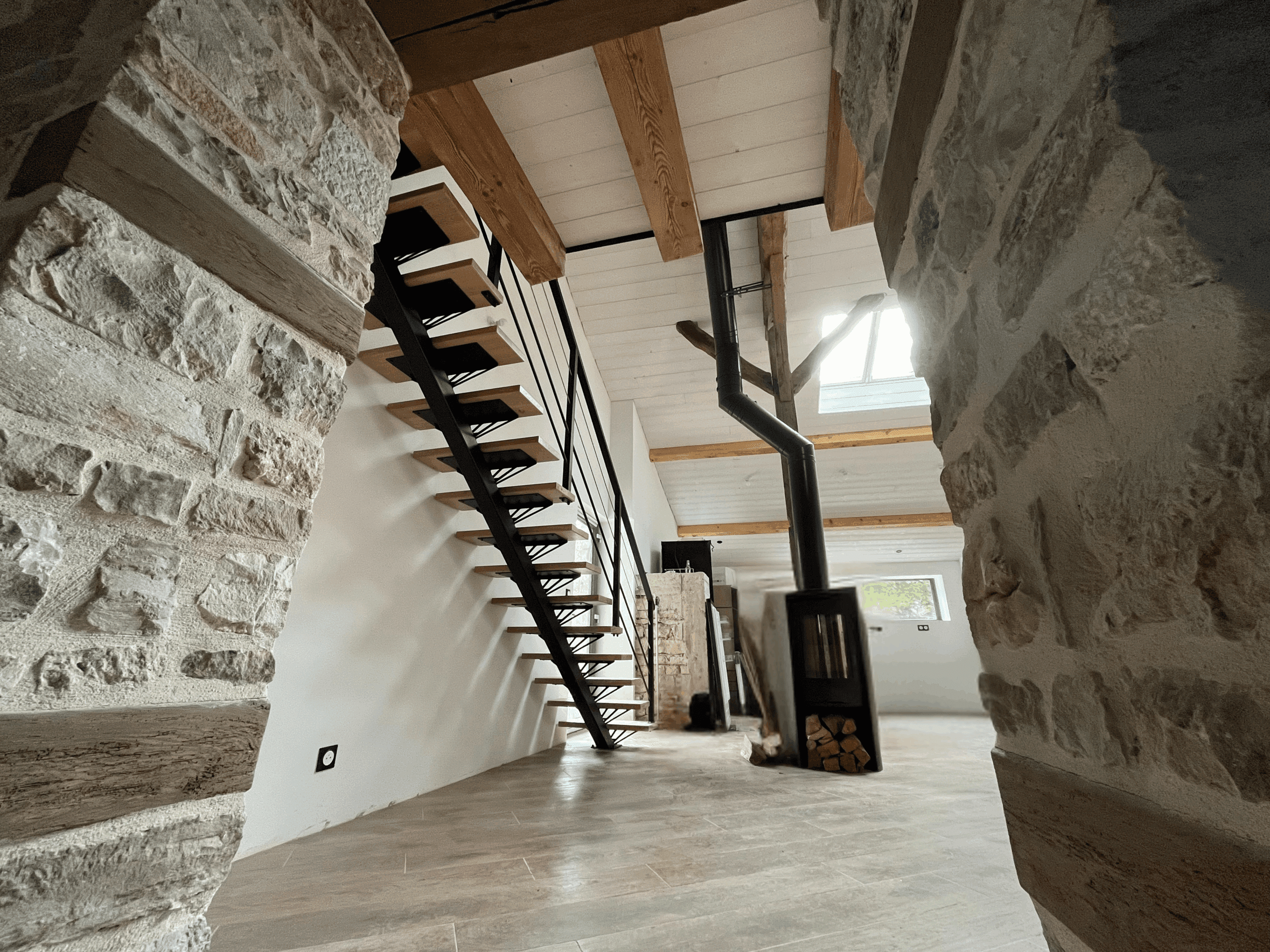 Création d’accès et mise en valeur d’une habitation de charme grâce à cet ensemble escalier limon centrale et garde-corps.