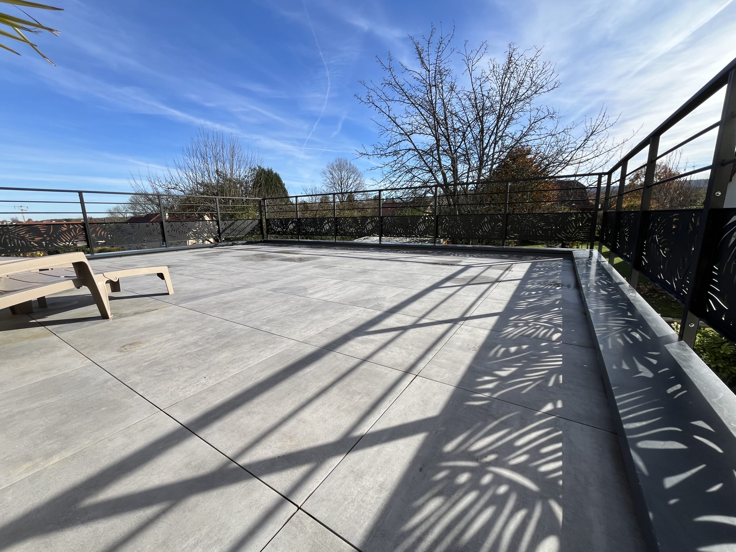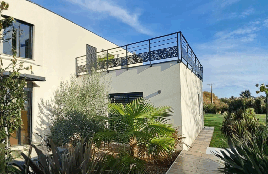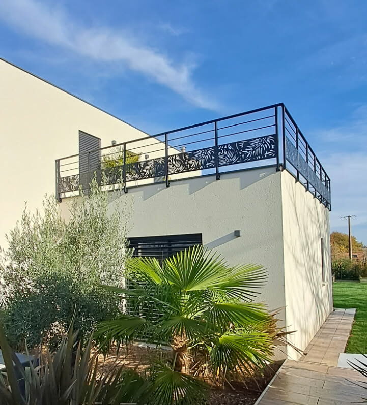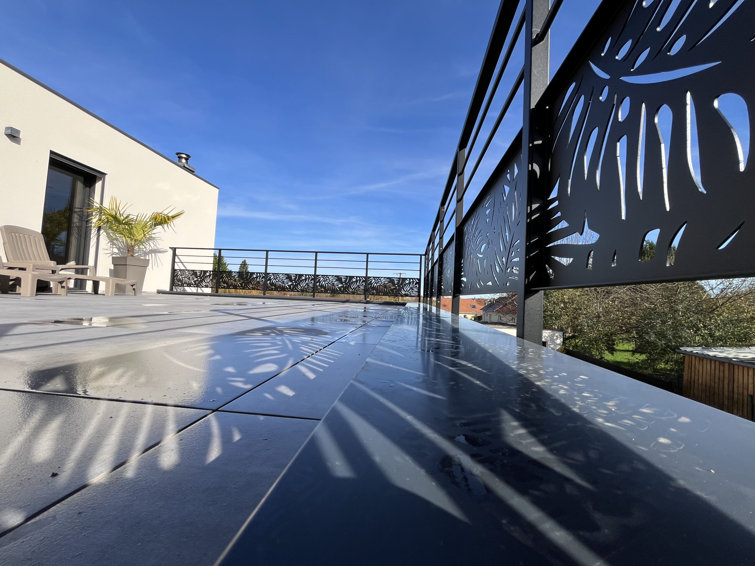 Bel aménagement extérieur dans maison moderne avec garde-corps aluminium RAL 9005 (noir) et remplissage tôle à motif