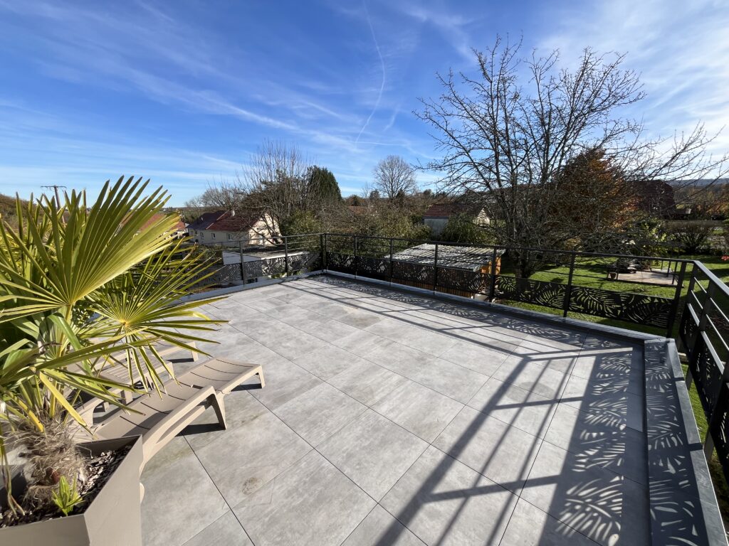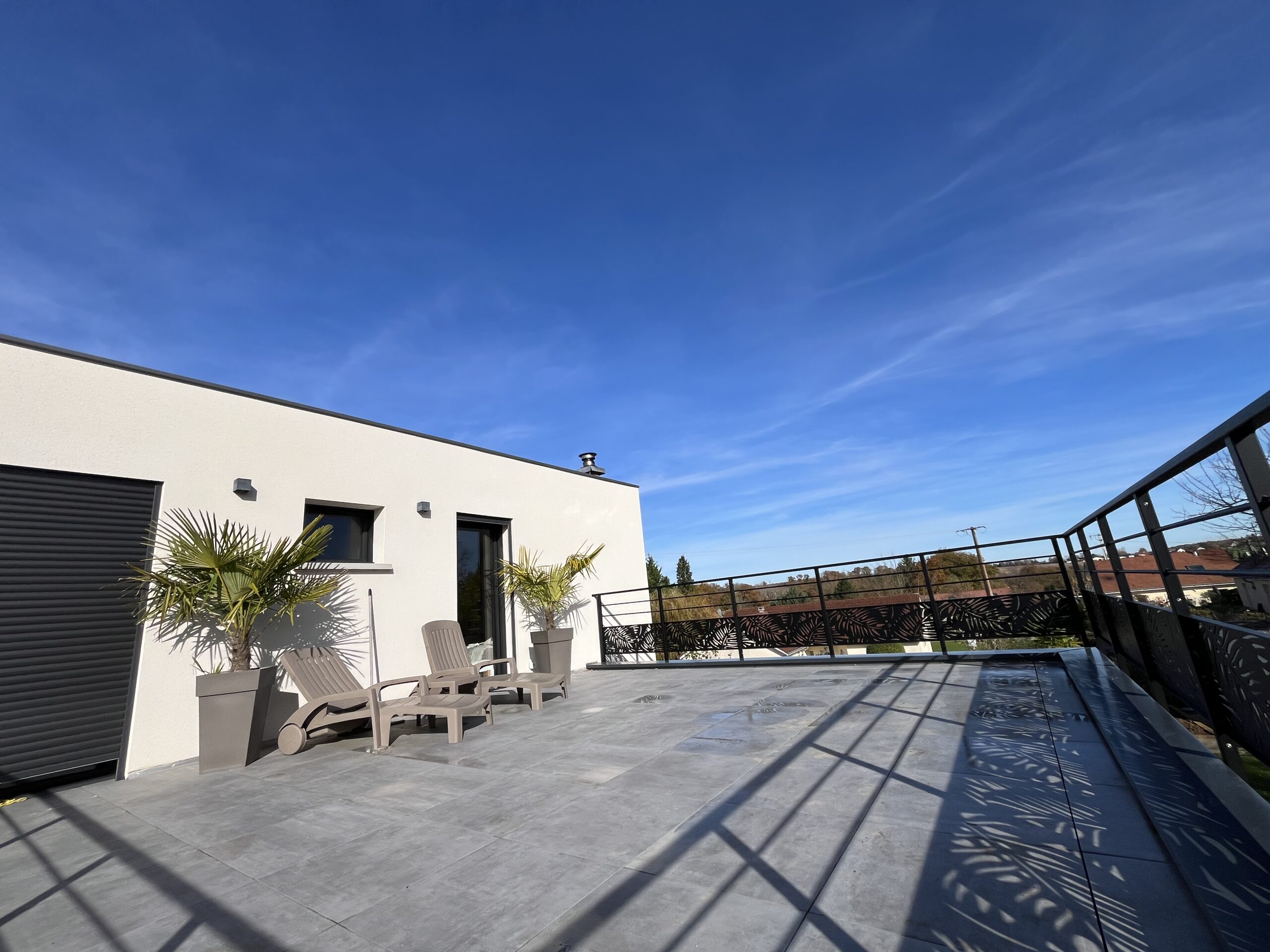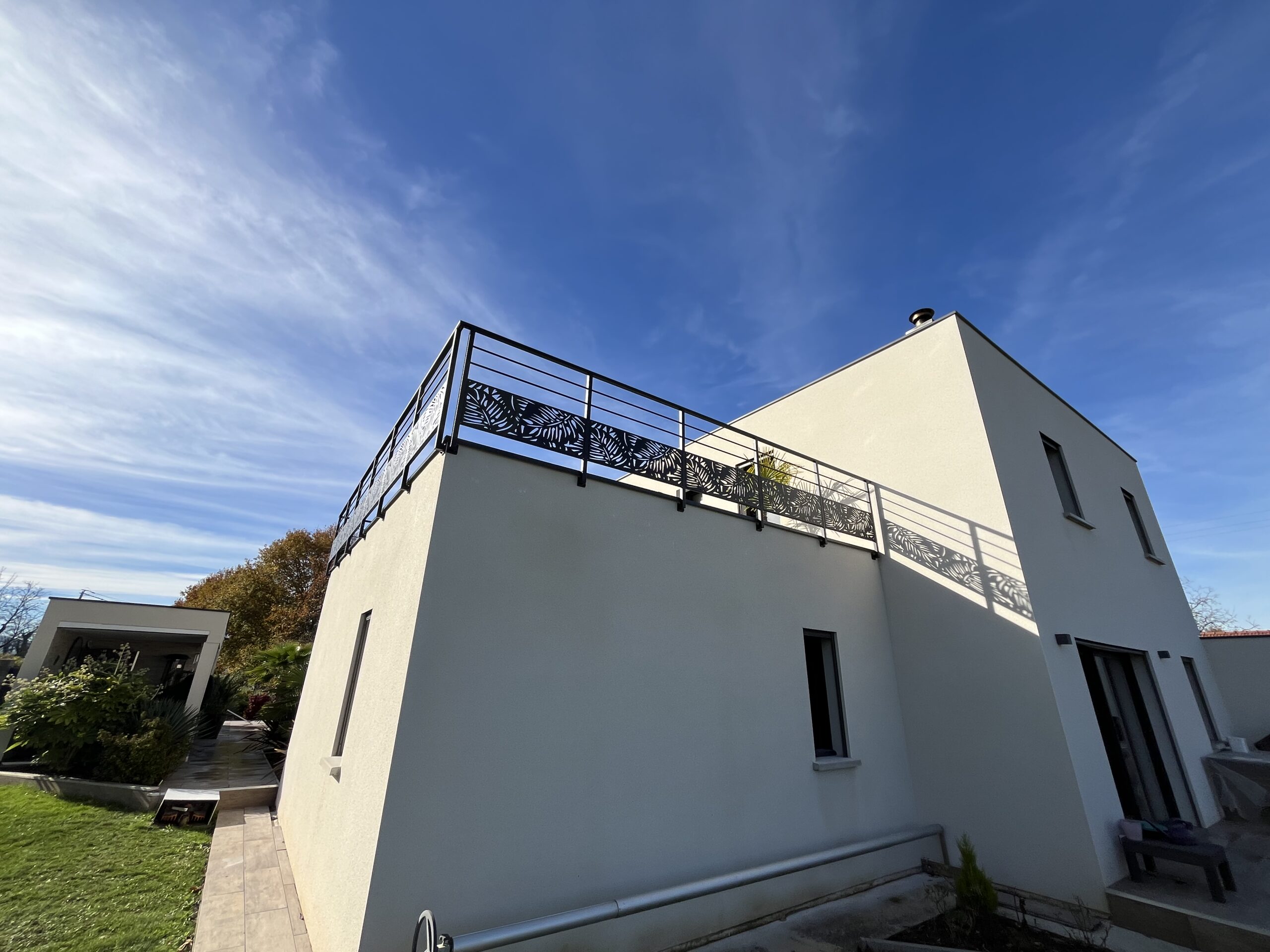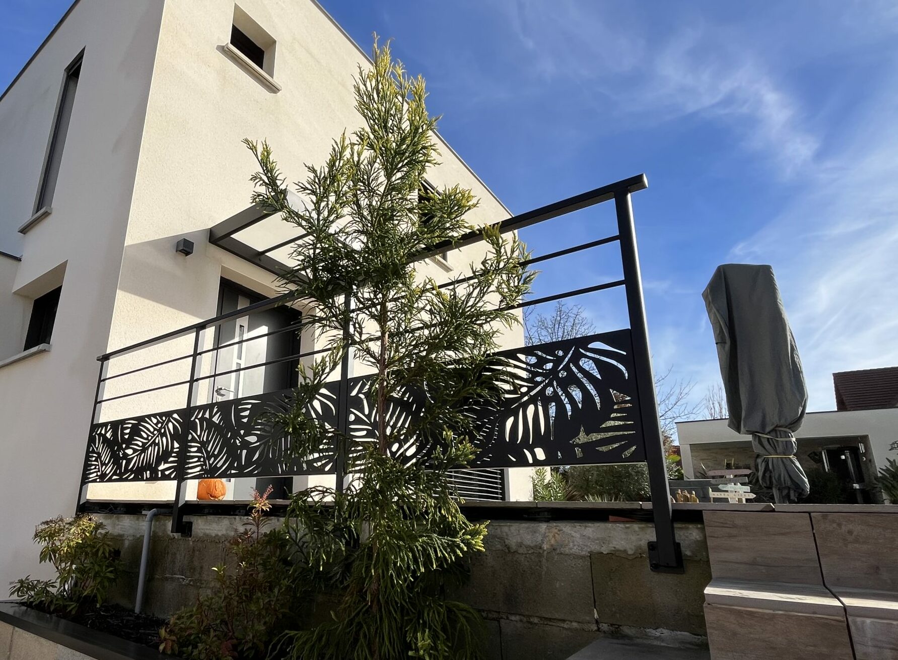 Bel aménagement extérieur dans maison moderne avec garde-corps aluminium RAL 9005 (noir) et remplissage tôle à motif