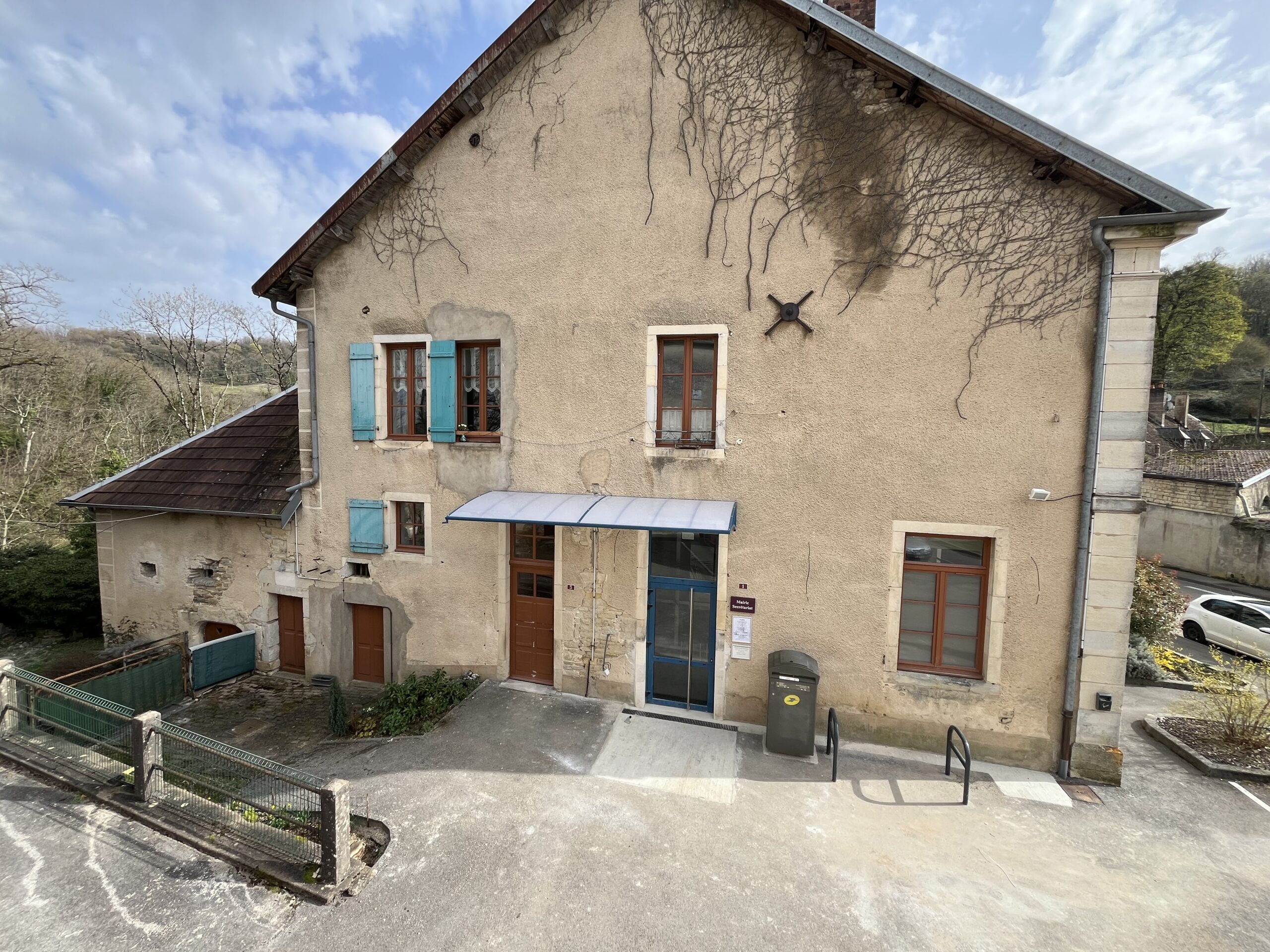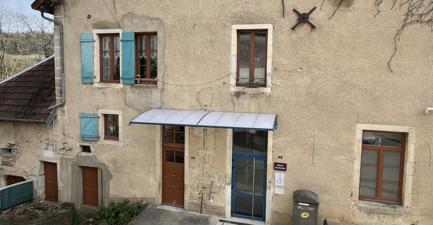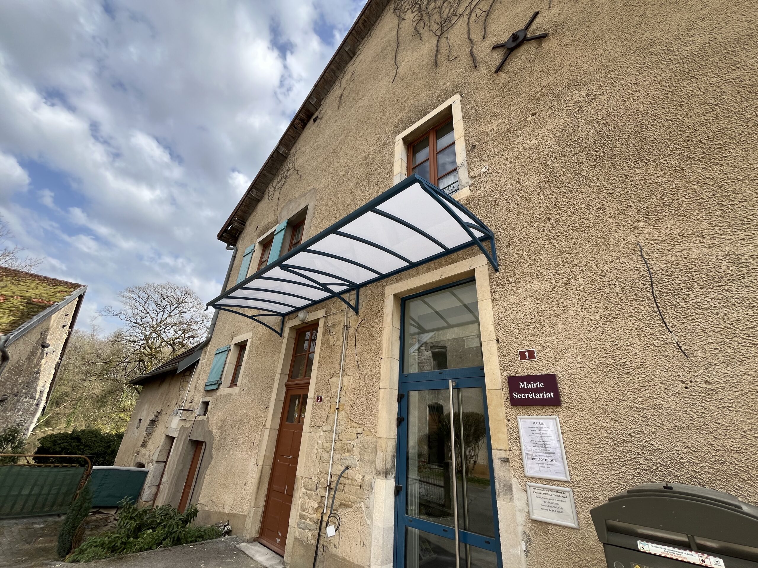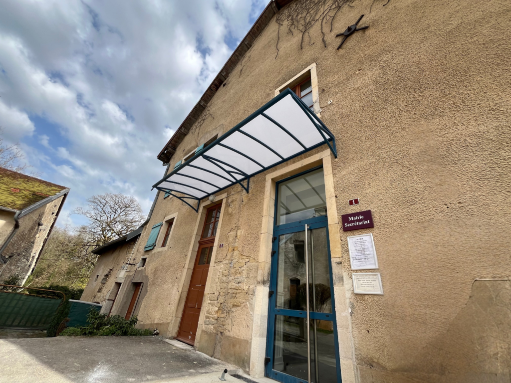 Cette marquise en aluminium sur mesure abrite les deux accès de la mairie tout en s’intégrant harmonieusement à la façade existante. Sa structure aluminium thermolaqué et sa toiture translucide assurent protection contre les intempéries, luminosité et durabilité.