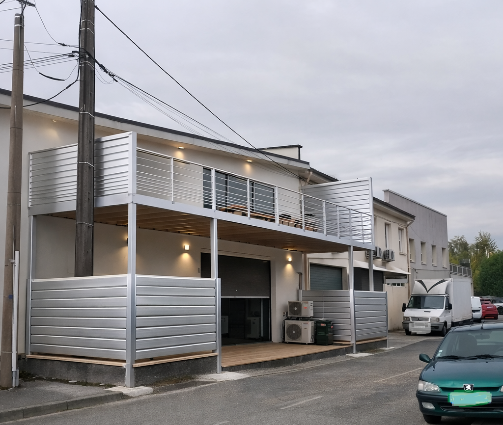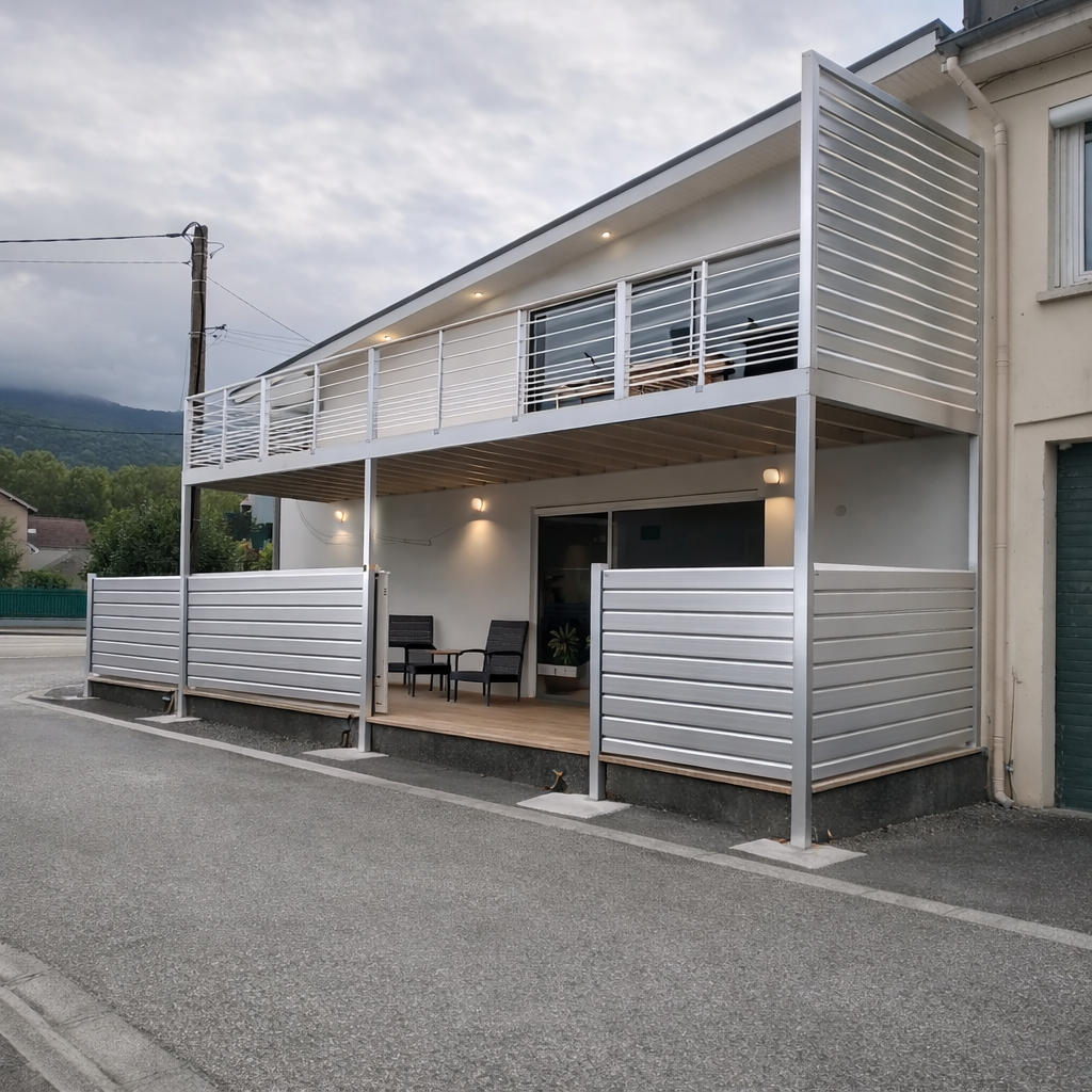 Cette terrasse aluminium sur mesure offre un véritable lieu de vie supplémentaire, alliant design contemporain et confort. Les brise-vues préservent l’intimité sans fermer l’espace, tandis que l’aluminium garantit une structure solide, esthétique et sans contrainte d’entretien.